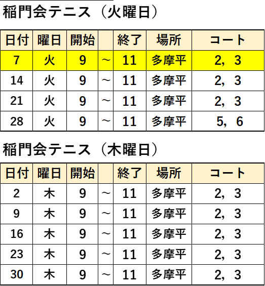 ※コート予約の都合により時間・場所が変わることがありますので、下記「3.コート予約日(直近)」で確認ください