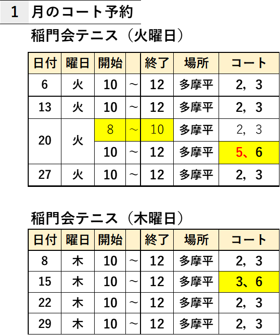 2026年1月のテニスコート予約(火曜日・木曜日)を掲載します