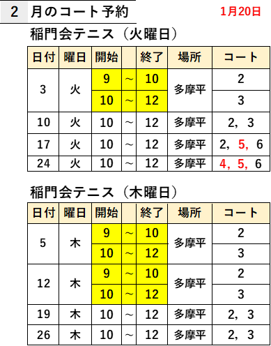 2026年2月のテニスコート予約(火曜日・木曜日)を掲載します