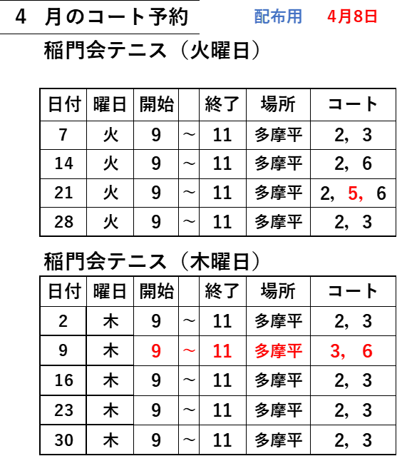 2026年4月のテニスコート予約(火曜日・木曜日)を掲載します